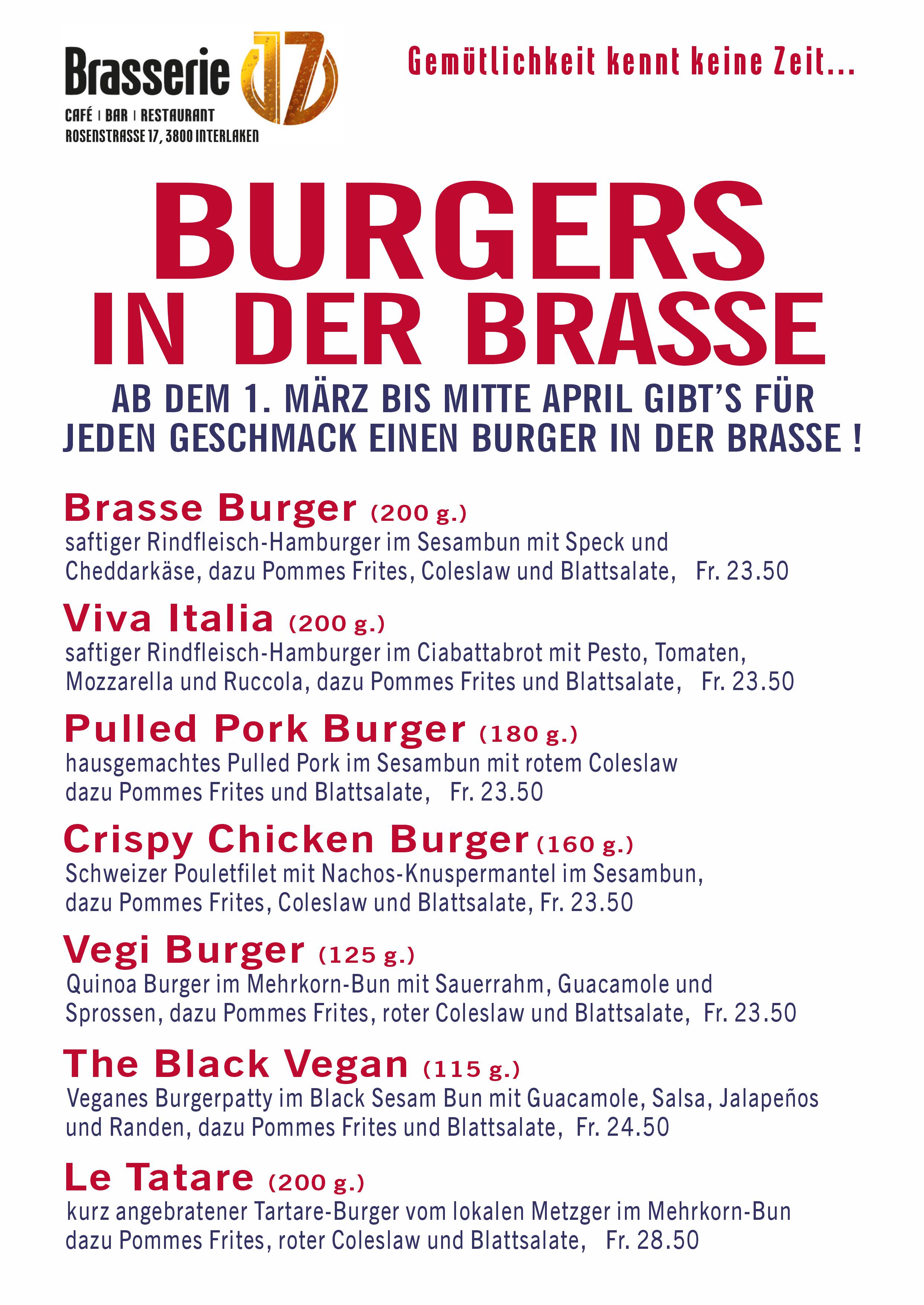 Vom 1. März bis Ende April gibt’s für jeden Geschmack ein Burger in der Brasse...